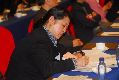 讨论时,全国政协委、著名主持人倪萍仔细地做着记录