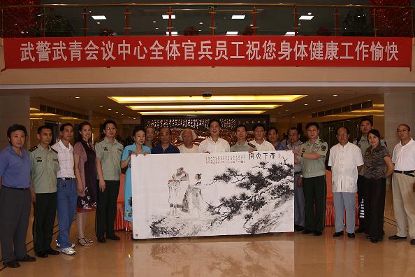 武警总部后勤部领导和书画家们及共同创作的作品《天下大同》合影