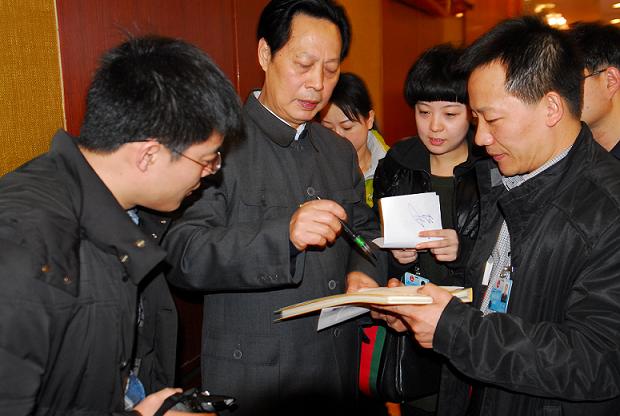媒体访问结束后,记者们当起了“粉丝”索要汪国新委员签名