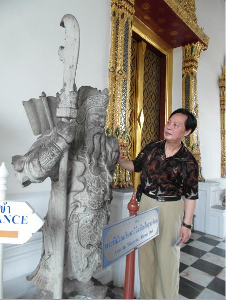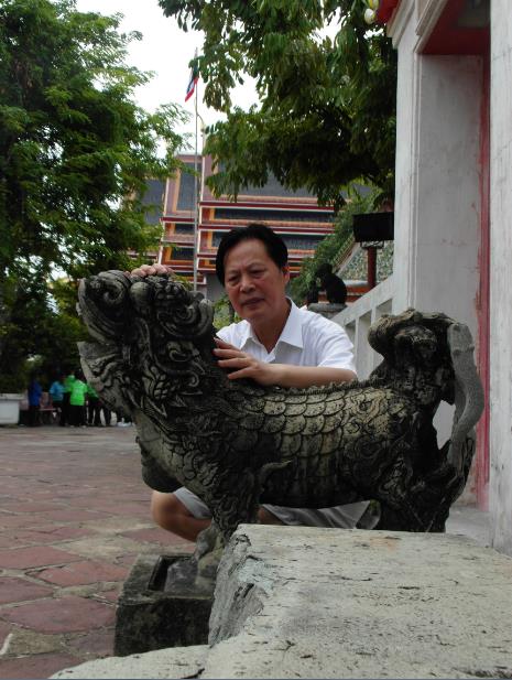 汪国新老师在寺庙门口仔细研究泰国雕塑艺术